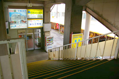 | ホームへの通路より、駅舎を見る。 当駅にはエレベーターがなく、バリアフリー化はされていない。 |