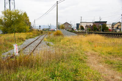 | 構内西側(駅横)の旧貨物ホームがあったあたりを見る。 現在は旧貨物側線より少し角度を変えて敷設し直された側線がある。 保線車両用の待避線となっているようだ。 |