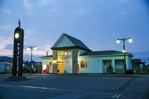 | 駅舎出入口。 駅無人化後に改築された駅舎で、お洒落な造りをしている。 左側のドアがKIOSKのある待合所、右側のドアが物産展示室の出入口である。 |