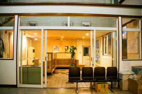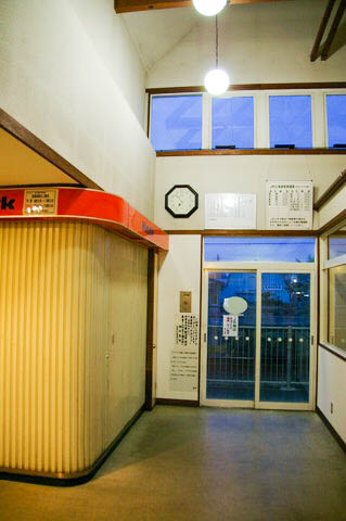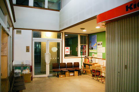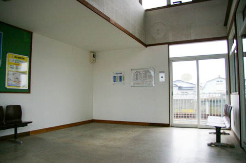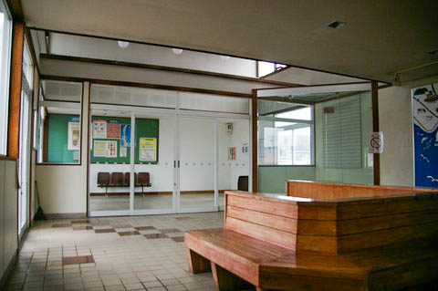 | 待合室脇にあった町の特産品展示コーナーより、駅舎側の待合室方向を見る。 無人化されたため、陳列ケースや展示品も撤去され、観光案内のみ残っている。 |