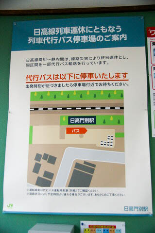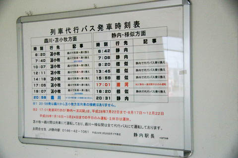 | 駅舎内に掲示された、列車代行バス発車時刻表。 | ||||||||||||||||||||||||||||||||||||||||||||||||||||||||||||||||||