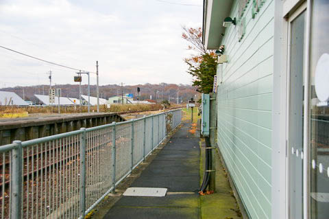 有人駅時代は駅舎正面すぐ(写真左手)に構内踏切があったが、無人駅化により 駅舎を経由せずにホームへアクセスできる構造に変更されたようだ。 |