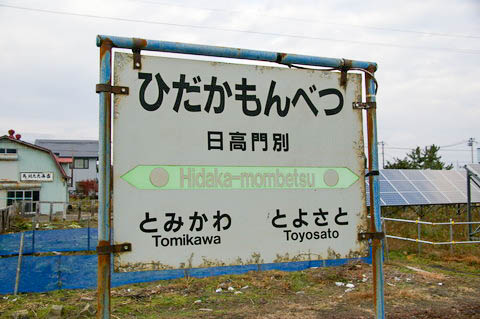 駅名は開業時の地名である 『沙流郡門別村字門別町』 より 字名が採用されている。 尚、『門別』 はアイヌ語名の 「モ・ペツ」 (静かな川)から。 駅名に ”日高” を冠したのは、道内各所にある同語源の 「もんべつ」 と区別するため。 |