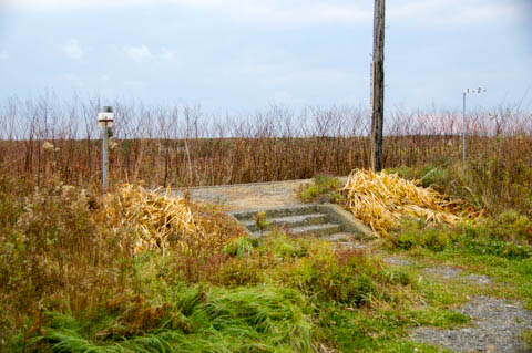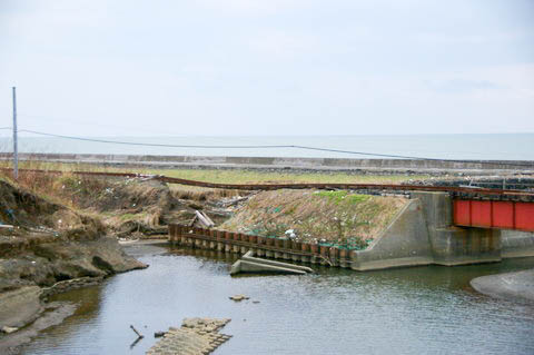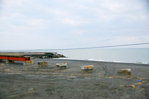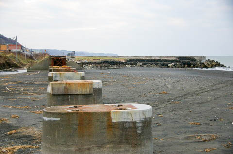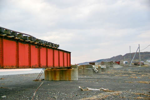 | 残された橋脚群。(下り清畠・静内・鵡川方面を見る) 橋脚は河口部の砂浜に設置されており、あまりにも海が近く、また背も低い。 復旧のため慶能舞川の東側(清畠側)に工事事務所が設置され、 再架橋や線路敷設の準備も進んでいたようだが、 JRが路線復旧を断念したため、橋脚はこのまま放置されると思われる。 |