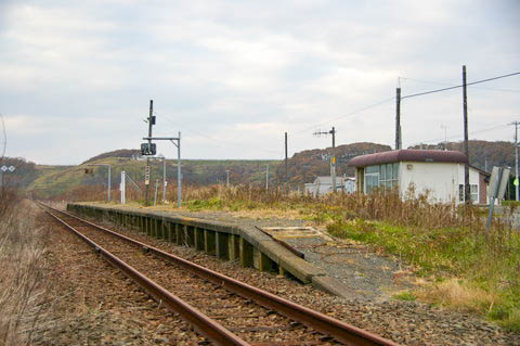 | ホーム西寄り(日高門別寄り)から、下り静内・様似方面を見る。 ホームから少し離れて左手に待合室がある。 1953年(昭和28年)6月撮影の航空写真には、島式ホームが写っており、 現待合室の場所にある旧駅舎とを連絡する構内踏切が確認出来る。 |