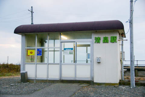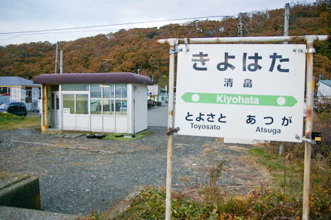 | ホームより、建植型駅名標と待合室を見る。 開業時の駅名は 『慶能舞(けのまい)』 であった。 この駅名は、地名である 『沙流郡門別村字慶能舞』 より 字名が採用されている。 慶能舞(けのまい)はアイヌ語の 「ケニ・オマ・イ」からで、ヒルガオの根・ある・所の意である。 尚、字名は1936年(昭和11年)に 『慶能舞』 ⇒ 『清畠、賀張』 となり、それに伴い 駅名も1944年(昭和19年)に 『清畠』 へ変更されている。 『清畠』 は、「清流をひいて作った畠どころ」 の意である。 また、『慶能舞』 は、行政上の地名として現在は消滅しているが、地区を流れる 『慶能舞川』 や、駅の北東3.5km程にあるコミュニティーセンター 『慶能舞生活館』 などに その名を残している。 |