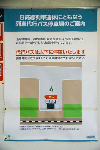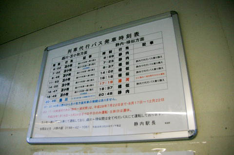 | 待合室内に掲示された、列車代行バス発車時刻表。 | ||||||||||||||||||||||||||||||||||||||||||||||||||||||||||||||||||