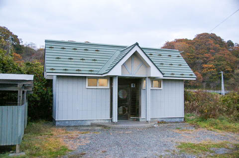 | 厚賀駅駅舎。 出入口左手にポストと飲料の自販機、右手に電話ボックスと駐輪場、トイレなどがある。 |