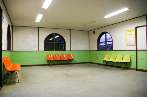 | 待合室内の様子。(ホームは右手) 正面のシャッターは売店跡と思われ、富川駅と同様に 乗車券の委託販売を行っていたようだ。 |