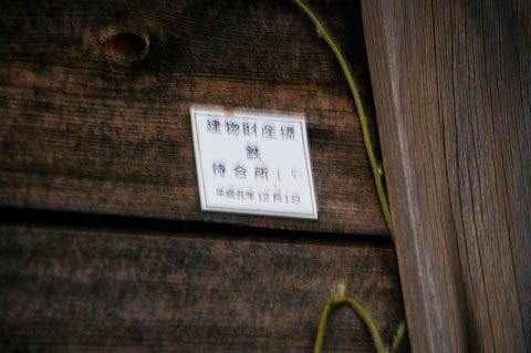 | 駅舎壁面の建物財産標。(写真がブレブレで申し訳なく・・・) 当駅舎は無人駅化後に建てられており、”待合所”として登録されている。 見えにくいが、「建物財産標 鉄 待合所1号 平成元年12月1日」 とある。 |
