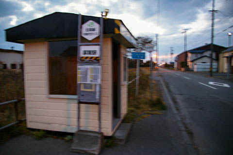 | 駅前を通る北海道道208号比宇厚賀停車場線にて、静内方面を見る。 道路左側に列車代行バスと路線バスの上り方面のバス停がある。 駅は道路先の横断歩道を左。 |