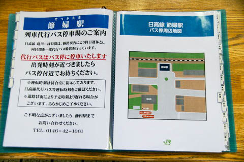 | 台風災害により、現在列車の発着はなくバス代行輸送が行われている。 代行バスは駅前ではなく、【町道節婦仲通線】 沿いに発着する。 写真は鵡川駅に置かれた【日高線代行バス乗降場所案内図】のもの。 |