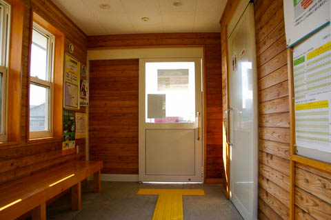 | ウッディーな待合室内にて、ホーム側から駅前広場側を見る。 右側の白い引き戸はトイレ。 |