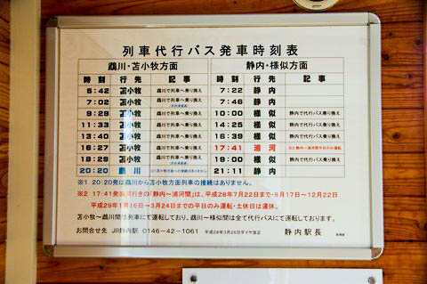 | 駅の待合室内に掲示された、列車代行バス発車時刻表。 | ||||||||||||||||||||||||||||||||||||||||||||||||||||||||||||||||||