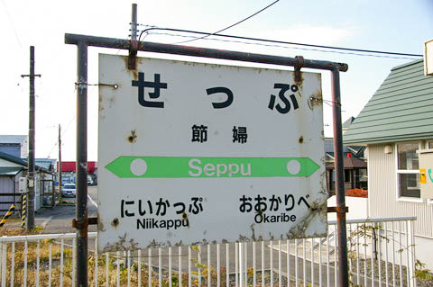 | 建植型駅名標。 駅名は開業時の地名である 『新冠郡新冠村字節婦』 より 字名が採用されている。 尚、『節婦』 はアイヌ語名の 「ポロ・セプ・ペツ」 (親なる広い川)から。 |