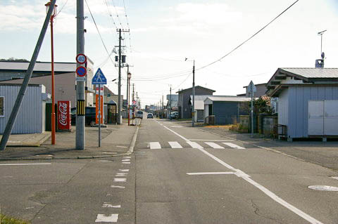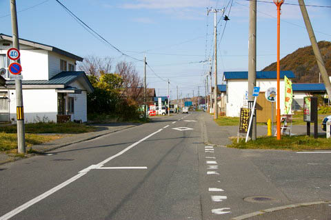 【町道節婦仲通線】 にて東側(静内方面)を見る。 道路左側の郵便局前に、道南バスの【節婦】停留所が置かれている。 駅は左手奥。 |