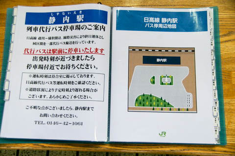 【静内駅】 停留所は、駅前ロータリーの駅舎前にある 道南バス1番のりばに併設されている。 列車代行バスは当駅で運転系統が別れており、鵡川⇔様似間は当駅にて 接続するバスに乗り換えることになる。 道南バスのりばは、1番(主に長距離バス)、2番(主に市内)に別れている。 |