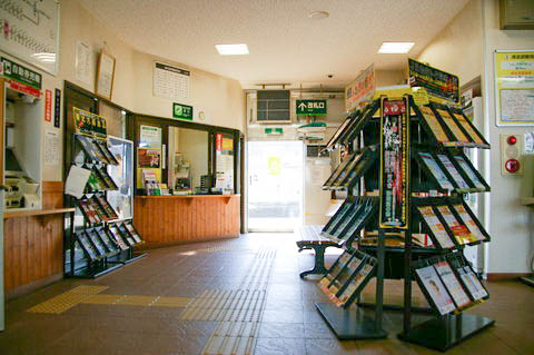 『観光情報センターぽっぽ』 に入ると待合所がある。 『駅舎』、『ぽっぽ』、『バスターミナル』 と、出入口は3ヶ所あるが、 建物内はひとつになっている。 正面に売店兼観光案内所があり、道南バスの自動券売機が置かれている。 JRのきっぷうりばおよび改札は、サラブレッドの向こう側にある。 |