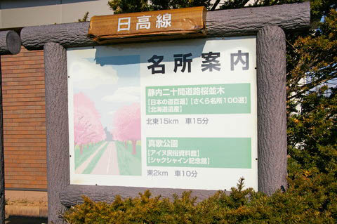 【静内二十間道路桜並木】 と、 アイヌ民俗資料館のある 【真歌公園】 が案内されている。 |