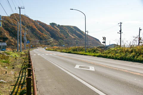 | 【仮称・有勢内踏切】付近より、国道235号線の東側(浦河・様似方面)を見る。 横断歩道のある所が踏切への道である。 |