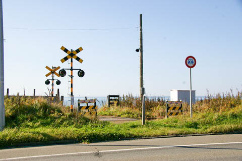 【仮称・有勢内(うせない)踏切】 にて海側(南側)を見る。 この踏切の右手(東側) 300m程に静内海水浴場臨時停車場があった。 |