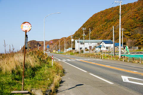 | 【仮称・有勢内踏切】付近より、国道235号線の西側(静内・苫小牧方面)を見る。 踏切近傍に道南バス上り 【有勢内沢】 停留所が置かれている。 下り側停留所は、この先約150m右側。 |