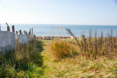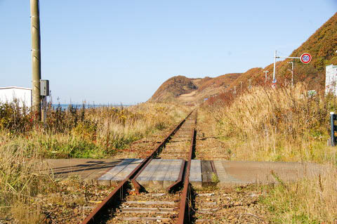 | 【仮称・有勢内踏切】より海側(南側)を見る。 現在静内海水浴場は廃止となっており、訪れる人も少ないようだ。 写真左手にはフェンスが設置されており、 フェンスの向こう側は私有地のようで、昆布干し場になっている。 |