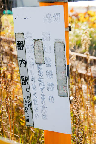とした理由はこの写真。 踏切名が消えてしまっている。 月形柵や信号器具箱にも踏切名表記がない。 当踏切は警報機のみで遮断機のない第3種踏切となっている。 |