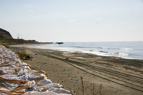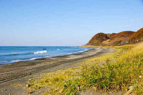 | 海沿いに出て西側(静内・苫小牧方面)を見る。 このあたりが【静内海水浴場】であったと思われる。 臨時駅は、列車を降りるとすぐ砂浜という立地に設定されていた。 |