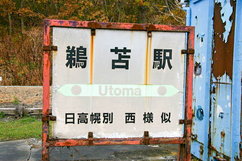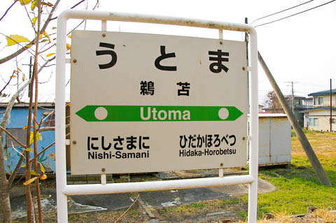 | 建植型駅名標。 駅名は開業時の地名である 『様似郡様似村字鵜苫』 から 字名が採用されている。 1906年(明治39年)の合併により、様似村が誕生する以前の当地は ”様似郡鵜苫村” であった。 ”鵜苫” は、アイヌ語の”ウトマン・ペツ” = ”抱き合う・川” = ”鵜苫川” に由来しており、 鵜苫川がかつて日高幌別川と合流していたことから付けられた地名である。 |