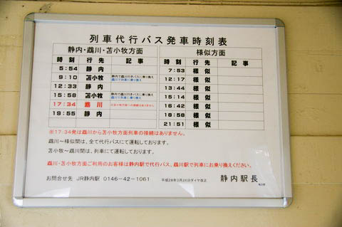 | 待合室内に掲示された、列車代行バス発車時刻表。 | ||||||||||||||||||||||||||||||||||||||||||||||||||||||||||||||||||