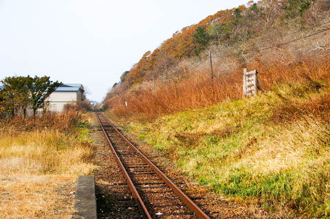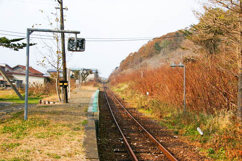 | 待合室前よりホームを見る。 ホームへの階段・通路は旧構内踏切であろう。 かつては島式ホームで交換設備を有したが、無人駅化の1977年(昭和52年)2月 以前に 設備の運用が廃止されたと思われる。 待合室側のホーム法面はスロープ状に造成され、 島式ホームの面影も少なくなっている。 |