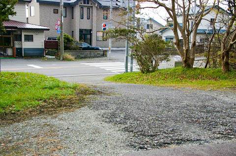| 待合室前より、駅前広場を見る。 駅前を国道336号線が通っている。 (左が様似方面) 尚、横断歩道先の大きな建物は一般の民家である。 |