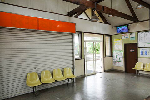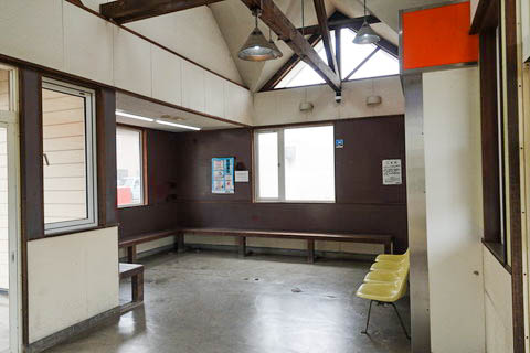 | 駅舎内の待合スペースにて、ホーム側出入口方向を見る。 シャッターが下りている部分は ”KIOSK” 跡で、上部に薄く文字が残る。 無人駅化後に ”KIOSK” が営業していた例は、道内では日高本線の日高門別駅などがある。 記録にはないが、無人駅化後、この ”KIOSK” で乗車券の委託販売を行っており、 ”KIOSK” の閉業後に 駅前商店へ簡易委託というストーリーだったのではないかと考える。 |