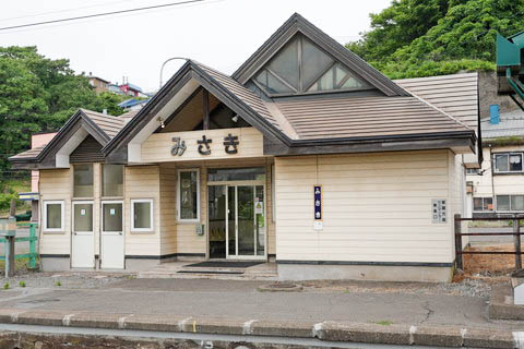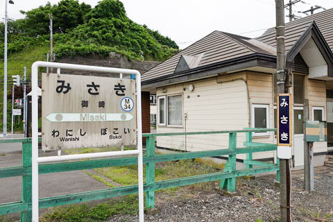 | 駅舎脇の建植型駅名標と柱用駅名標。 北海道の駅でくまなく見られ、1984年(昭和59年)から始まった 柱用駅名標下部の ”サッポロビール” の広告は、 広告施策の見直しの一環として、 広告主側とJR北海道との協議により、2021年(令和3年)6月より順次撤去されている。 当駅が御崎駅と称したのは1905年(明治38年)、駅のある御崎町が誕生したのは 1922年(大正11年)で、 町名より駅名が古いが、御崎町の誕生以前に 当地が 『御崎』 と呼ばれており、駅名は地名からという説が有力である。 また、『御崎』 という地名は、旧来の地名である 『エトチケレッポ』 に由来する。 このアイヌ語由来の地名は 『岬』 を意味し、これに 『御崎』 の字を当てた説が 有力と思われるが、岬状の地形に由来する説など、諸説あるようだ。 |