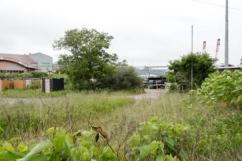 | 下り(駅舎対面側)ホーム中程より、西側(海側)の旧構内を見る。 1958年(昭和33年)8月に建立された 『室蘭線発祥の地の碑』 があるようだが、 ホームからはその所在はわからない。 碑およびその周囲は メンテナンスされないまま放置され、碑は朽ちて倒壊したとの情報がある。 |