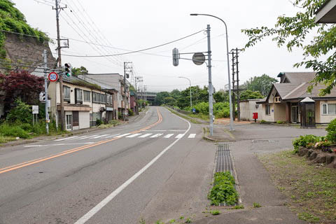 | 駅前の市道(旧国道36号線)にて南側(室蘭方面)を見る。 駅は右手。 | ||||||||||||||||||||||||||||||||||||||||||||||||||||||||||||||||||