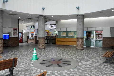 | 駅舎出入口(右側)前付近より、駅舎内を見る。 駅舎内は円形を主体とした形状をしており、中央部は吹き抜けになっている。 正面奥が改札口である。 |
