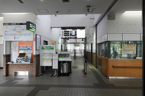 | 自動券売機前より、改札右手を見る。 奥にトイレが設置されている。 無人駅化以前は改札ラチ脇の窓口で発車10分前より改札を行っていた。 また、掲示物が2枚見える部分に 『みどりの窓口』 があった。 |