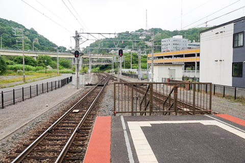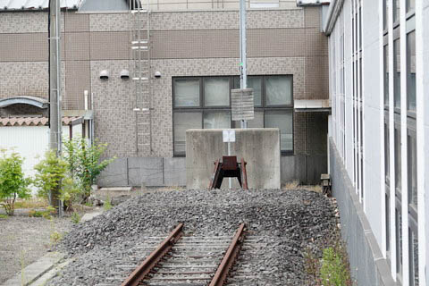 | 1番のりば西端より、室蘭本線支線の車止めを見る。 砂利を盛った第一種車止めと、鋼材を組んだ第二種車止めを 組み合わせたものが使われている。 |