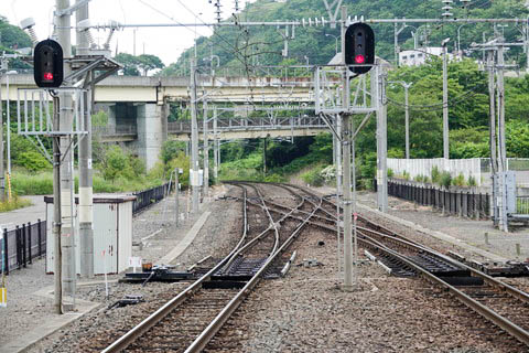 | 2番のりば東端(母恋寄り)から、線路終端方面を見る。 | 2番のりば東端(母恋寄り)から、下り東室蘭方面を見る。 各線の出発信号機とシーサスクロッシング(両渡り線)が見える。 線路をオーバーパスしている大きな陸橋は、国道36号線の 『入江高架橋』 で、 小さな陸橋は一般道のものである。 |
