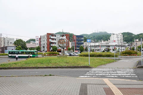 | 駅舎前より駅前を見る。 写真右奥(北側)に 『室蘭駅前通り』 が通っており、 左側(南側)の路線バスが停車している所が 駅前ロータリーになっている。 写真中央部で後ろの建物と同系色に見える球形の建造物は、 室蘭市の景勝地である 『地球岬』 をモチーフにしたモニュメントで、 『ようこそ むろらんへ』 とある。 尚 『室蘭駅前通り』 を北に向かうと 1km程に 『室蘭フェリーターミナル』 がある。 かつては青森便に加え、大洗や直江津へ長距離フェリーも発着していたが、 苫小牧港との競合や採算性の問題により、フェリーが発着しない時期もあった。 2023年(令和5年)10月より、津軽海峡フェリーにより航路が再開し、 青森⇔室蘭間 を 1往復/日 7時間で結んでいる。 |