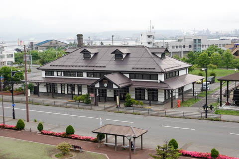 『北海道道699号室蘭港線』 の歩道より 旧室蘭駅舎(3代目駅舎)を見る。 室蘭駅は1997年(平成9年)10月に現在の4代目駅舎に移転後、 空き家となった当駅舎は1998年(平成10年)に室蘭市に譲渡された後、 市の観光協会が入居し、現在は観光案内所が開設されている。 |