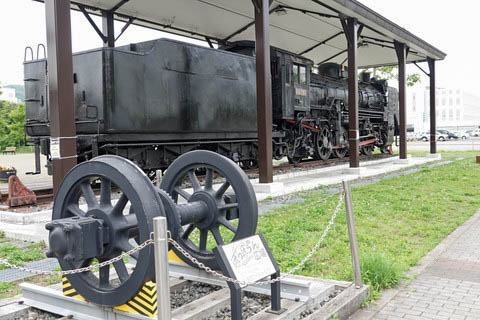 『旧室蘭駅舎公園』 (愛称:ぽっぽらん公園) として整備されている。 蒸気機関車 D51 560号機が静態保存されているが、旧来の線路上ではなく 展示用に新たにスペースを設け敷設した線路上に置かれている。 SLの説明板によると、戦前の苗穂製作所で製作された数少ない車両のひとつで、 室蘭本線の追分-室蘭間を含め、全道各地で活躍した車両とのこと。 脇に置かれた車輪は、大きさや車軸の歯車、軸箱などから SLのものではないと 思われるが、手前に 『ぽっぽらん公園』 の看板があるため、 鉄道広場を象徴するモニュメント的なものとしての設置であろう。 |