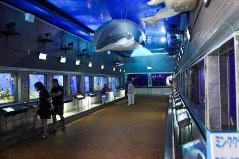 | 水族館内の様子。 回遊水槽など大型の水槽はなく、魚種や環境別の個別水槽での展示がメインである。 屋外展示はアザラシやペンギンなどで、各種イベントなども開催されている模様。 |