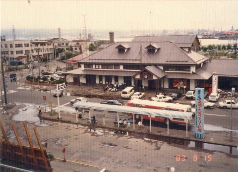 | 駅として現役の頃の3代目室蘭駅駅舎。 駅前のバス停の位置は現在と大きく変わっていないが、 バス停の大きな上屋が 発着本数と利用者の多さを表している。 バス停上屋右側の大きな建植看板には、『実現しよう!! 室蘭-大洗フェリー航路』 とある。 当該航路は、1985年(昭和60年)〜2002年(平成14年)に東日本フェリーにより 就航している。 1983年(昭和58年)8月 撮影。 |