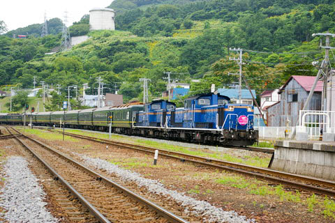 『トワイライトエクスプレス』 大阪発札幌行き特急寝台列車。 DD51重連(五稜郭-札幌間)+24系客車(トワイライト仕様)。 室蘭本線(長万部-苫小牧間)を経由する。 2008年8月撮影。 |