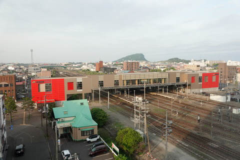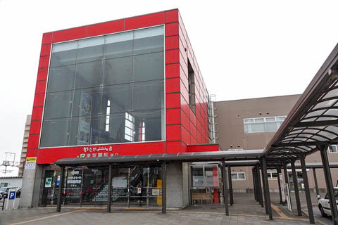 東口遠景。 矩形に赤く縁取られた部分が東西自由通路東口、その右手に駅舎が隣接している。 駅舎1Fには ”駅レンタカー” が入居しているようだ。 写真右手は広い東口ロータリーで、路線バスや高速バスが発着している。 |