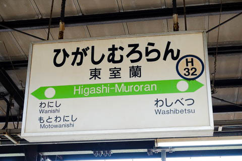 | 室蘭本線上り4番のりばの吊り下げ型駅名標。 当駅の全のりば(2〜5番のりば)が室蘭支線への乗り入れに 対応する配線になっている。 当駅の駅名は 『室蘭』 ⇒ 『輪西』 ⇒ 『東輪西』 と移転と共に改称を重ねており、 最終的には、室蘭市の東に位置することより 『東室蘭』 に落ち着いている。 |