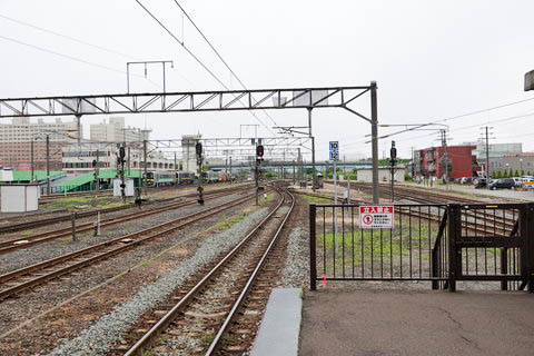 | 室蘭本線上り4番のりば南端(本輪西寄り)から、上り長万部、室蘭方面を見る。 300m程先を国道37号線の 『中島跨線橋』 が線路をオーバーパスしている。 また、跨線橋下付近で室蘭支線が左へ分岐している。 |
